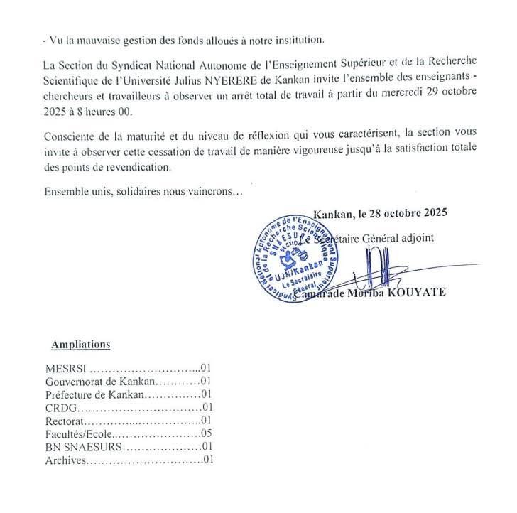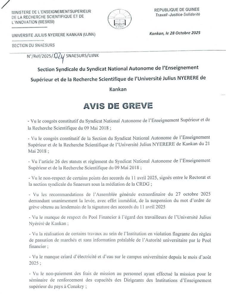 La Section Syndicale du Syndicat National Autonome de l’Enseignement Supérieur et de la Recherche Scientifique (SNAESURS) de l’Université Julius Nyerere de Kankan (UJNK) a annoncé une grève générale illimitée à compter du mercredi 29 octobre 2025 à 8h00. La décision a été officialisée à travers un avis de grève transmis aux autorités universitaires et administratives locales.