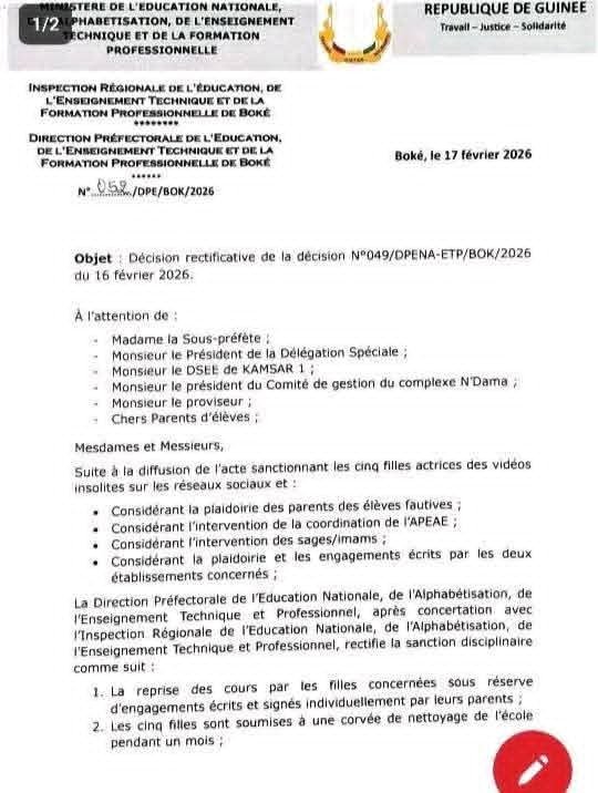 Revirement de situation à Boké. Sous la pression d’une médiation menée par les autorités religieuses et les parents d’élèves, la Direction Préfectorale de l’Éducation (DPE) a levé la sanction d’exclusion qui pesait sur les cinq jeunes filles des lycées N’Dama et Mohamed VI. Si elles retrouvent les bancs de l’école dès ce mardi, leur retour se fera sous haute surveillance et sera assorti d’une sanction symbolique.