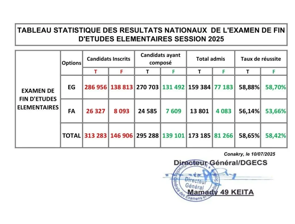 Ci-dessous, les Statistiques Nationales de l’Examen de Fin d’Études Élémentaires, session 2025.