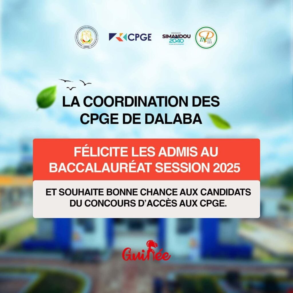 La Coordination des Classes Préparatoires aux Grandes Écoles (CPGE) de Dalaba a adressé, ce samedi 19 juillet 2025, ses félicitations aux élèves ayant réussi les Épreuves du Baccalauréat 2025. Dans un message publié à l’attention des lauréats, elle souligne que ce succès constitue une étape importante dans le parcours Académique des jeunes admis, fruit d’un travail constant et d’un engagement soutenu.