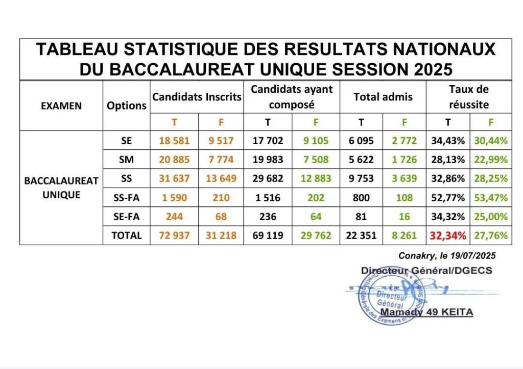 Les statistiques viennent tout juste de tomber. Un taux de 32,34% de réussite a été enregistré au Baccalauréat session 2025 en Guinée. C’est le Ministère de l’Enseignement Pré-Universitaire et de l’Alphabétisation qui a publié ce samedi 19 juillet, le tableau statistique des résultats Nationaux de cet Examen phare qui donne accès aux Institutions d’Enseignement Supérieur.