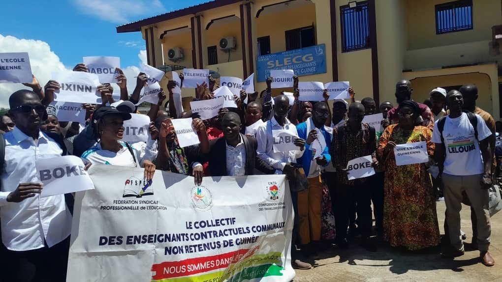 Ce lundi 13 octobre 2025, les enseignants contractuels non retenus, venus de Conakry à Yomou, se sont rendus au siège du SLECG, situé non loin du Bloc des Professeurs, pour se faire entendre des autorités à travers une manifestation pacifique.