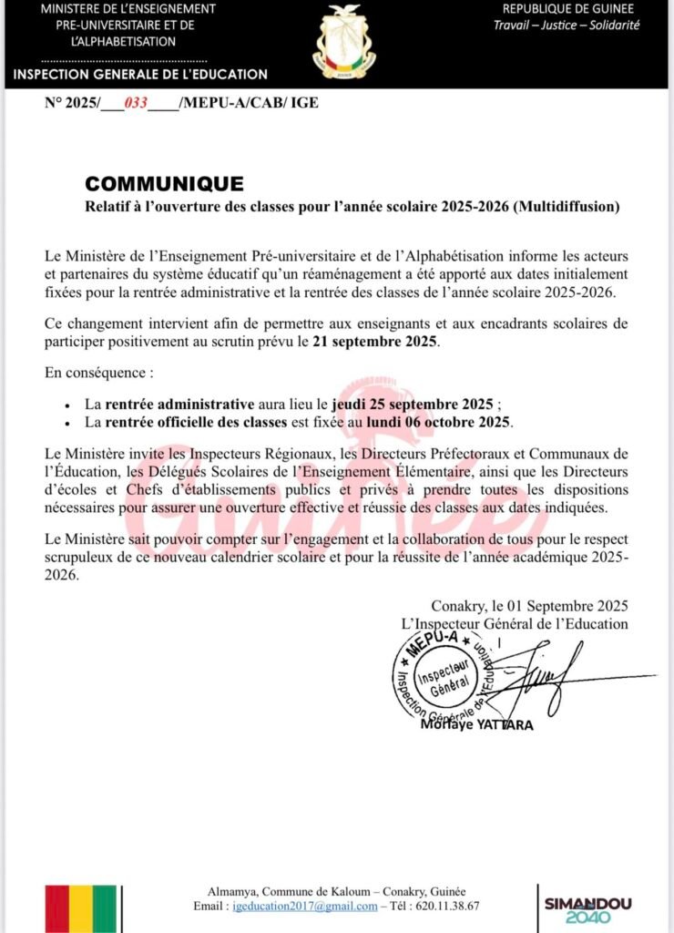 Dans un communiqué publié ce mardi 2 septembre 2025, le Ministère de l’Enseignement Pré-Universitaire et de l`Alphabétisation a procédé à un réaménagement du calendrier scolaire année 2025-2026. Initialement prévue au 15 septembre, l’ouverture des classes est désormais fixée au 6 octobre.