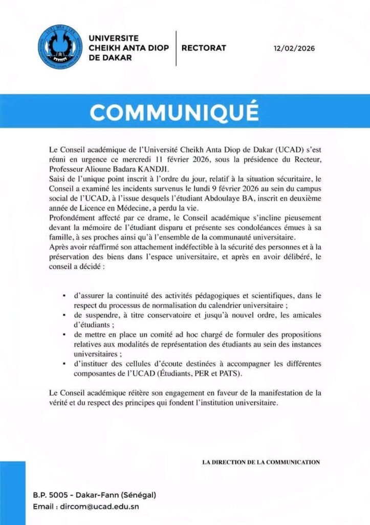 Sanction immédiate après le décès d’Abdoulaye Ba. Réuni en urgence ce mercredi 11 février, le Conseil académique de l’Université Cheikh Anta Diop a tranché : les amicales sont mises à l’arrêt « jusqu’à nouvel ordre ». Si la vie politique étudiante est gelée, le Recteur l’assure : le calendrier pédagogique, lui, ne bougera pas.
