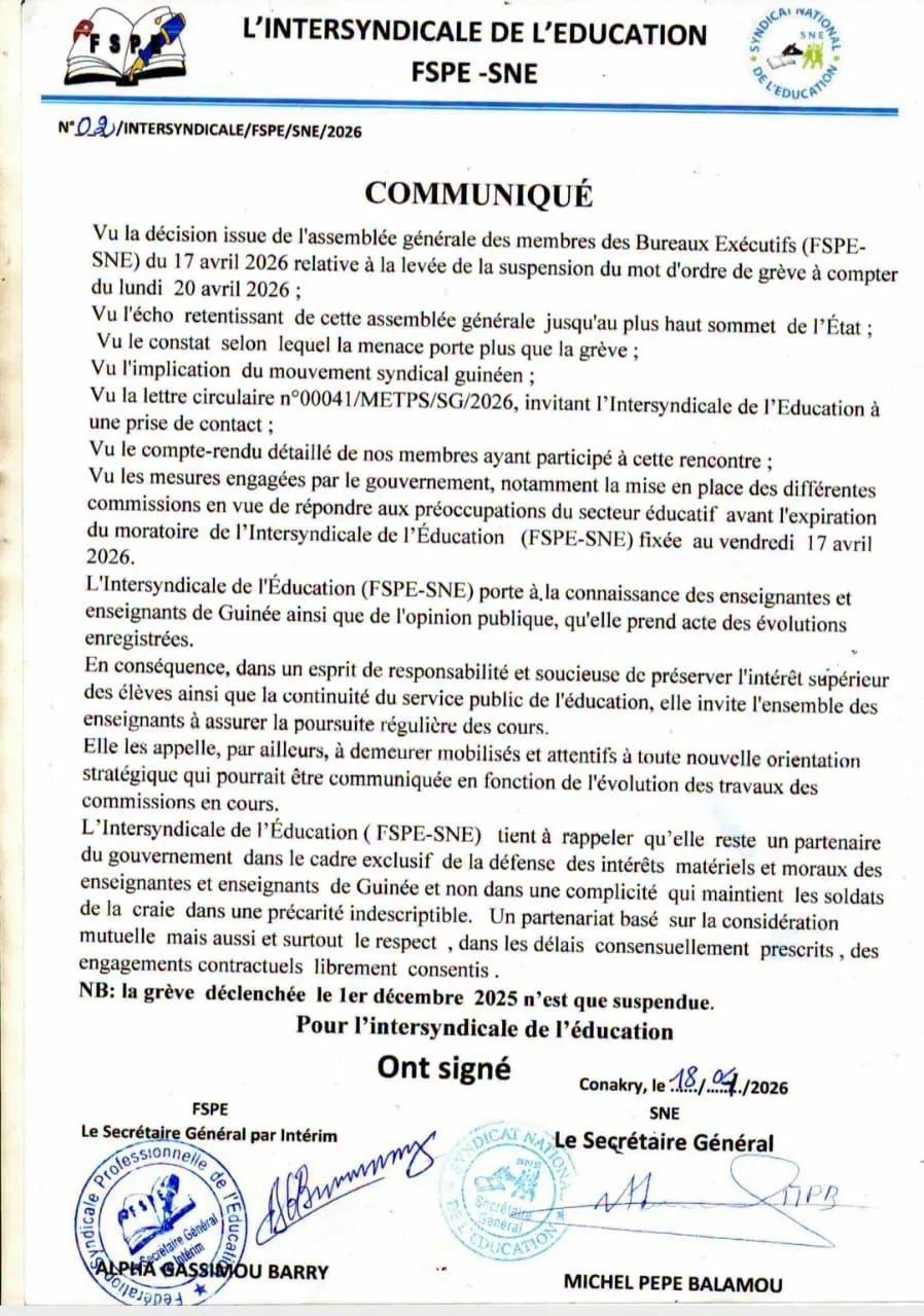 À la suite des avancées significatives enregistrées lors des récentes discussions avec les autorités éducatives — notamment la mise en place effective de commissions de travail paritaires pour traiter les points de revendications l’Intersyndicale annonce la suspension de son mot d’ordre de grève initialement prévu pour ce lundi 20 avril 2026.