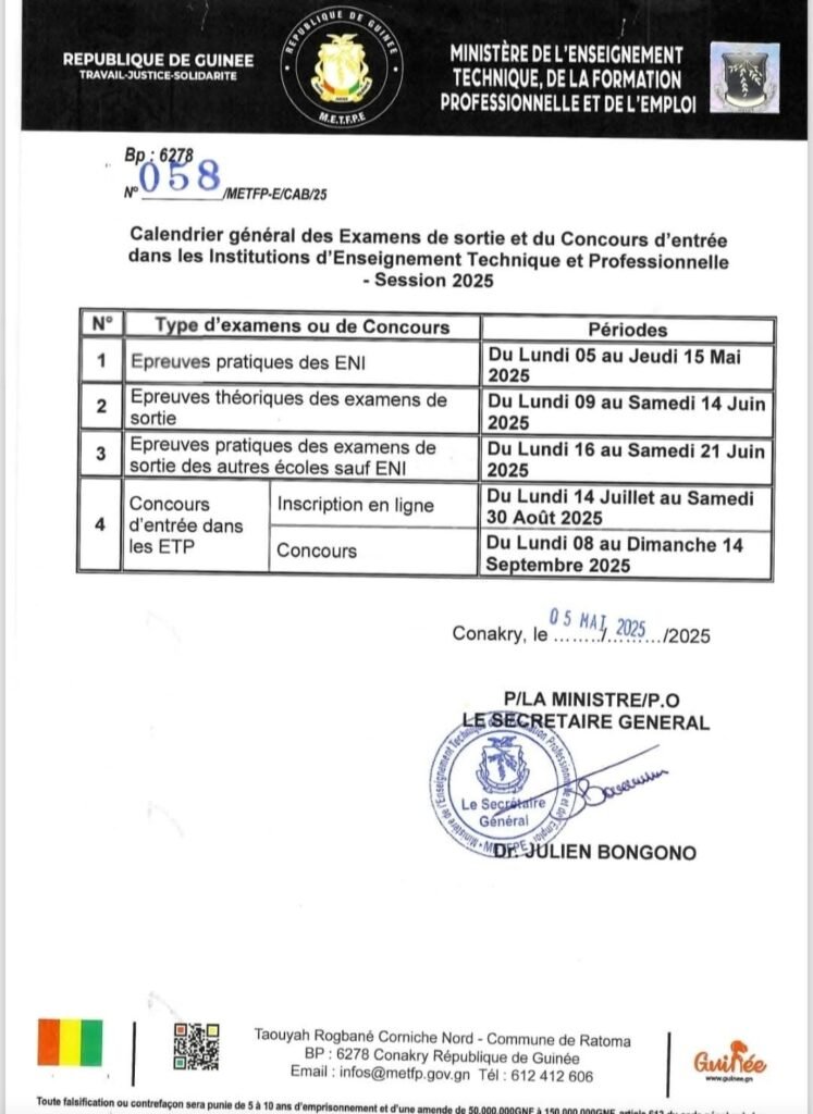 Le Ministère de l’Enseignement Technique et de la Formation Professionnelle et de l’Emploi a publié ce lundi 2 juin 2025 le calendrier général des examens de sortie et des concours d’entrée dans les institutions d’enseignement technique du pays.