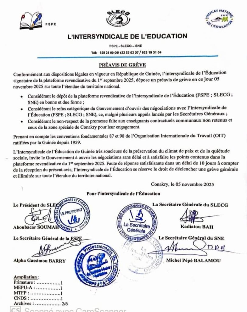 Un parfum de grève nationale plane sur l’éducation guinéenne. L’intersyndicale de l’Éducation, composée de la FSPE, du SLECG et du SNE a déposé ce mercredi 5 novembre, un préavis de grève sur toute l’étendue du territoire national.