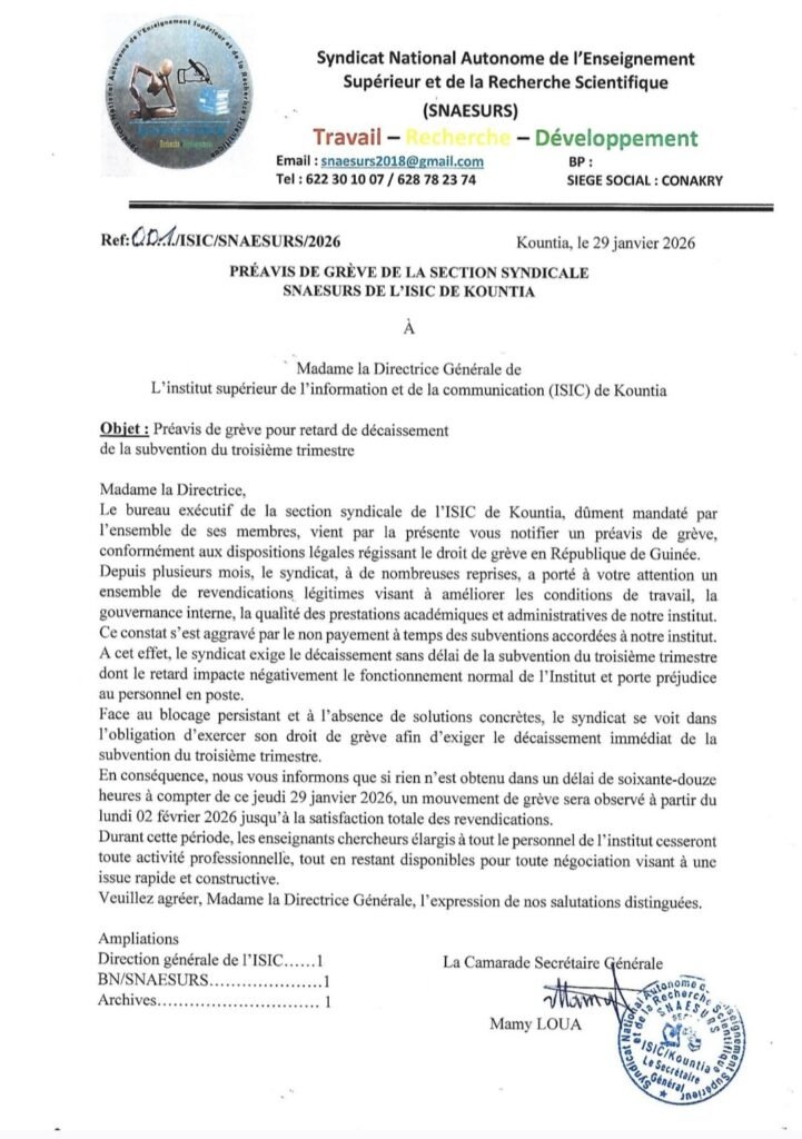 Le climat social se dégrade dangereusement à l’Institut Supérieur de l’Information et de la Communication (ISIC) de Kountia. La section syndicale du SNAESURS vient de poser un ultimatum : si les revendications ne sont pas satisfaites, les salles de classe resteront vides dès le lundi 02 février 2026. Entre coulisses et colère, voici les points qui mettent le feu aux poudres.